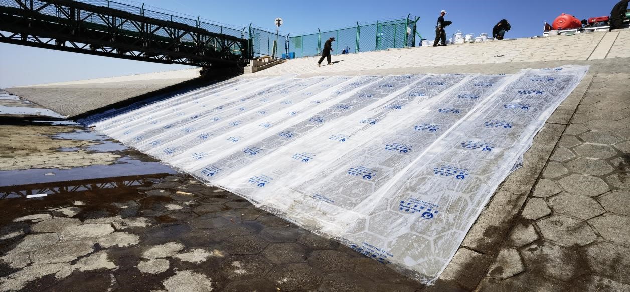 混凝土節(jié)水保濕養(yǎng)護膜,是以新型可控高分子吸水材料為核心,以塑料薄膜為載體,通過設(shè)備加工復(fù)合而成的卷材產(chǎn)品。其中高分子材料可吸收自重200倍的水分子, 吸水膨脹后變成透明的晶狀體,把液態(tài)水變成固態(tài)水,每平方米養(yǎng)護膜可蓄水0.5KG,成為一個固態(tài)的微型水庫,然后通過毛細管的作用向混凝土養(yǎng)護面滲透, 同時不斷吸收混凝土在水化過程中產(chǎn)生的蒸發(fā)水,因此在一個養(yǎng)護期內(nèi)總能保持混凝土表面濕潤。